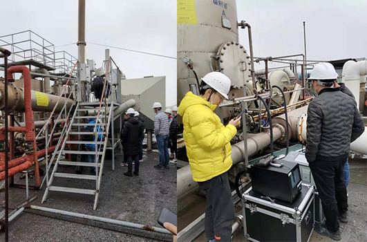 各廠家抵達(dá)工況現(xiàn)場,下午13點(diǎn)開始架設(shè)設(shè)備、預(yù)熱儀器,由于天氣潮濕原因SE3800開始時(shí)點(diǎn)火困難,經(jīng)過一段時(shí)間的預(yù)熱,儀器FID成功點(diǎn)火,15分鐘后FID基線平穩(wěn),儀器狀態(tài)良好,可以實(shí)施監(jiān)測工作。13點(diǎn)40分,所有廠家儀器準(zhǔn)備就緒,同一時(shí)刻開始進(jìn)行監(jiān)測工作。樂氏科技與嶗應(yīng)將儀器采樣探針插入工藝入口,開始采集樣品收集數(shù)據(jù)。